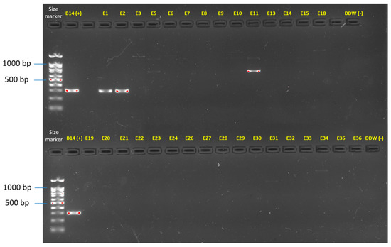 Molecular identification of the F. oxysporum f. sp. cepae secreted in xylem genes 3 (SIX3, primer sets and references in Table 1). The gel presented is uncropped. This analysis was performed on all the Fusarium isolates (detailed in Table 3). Only two isolates (E1 and E2) were identified using this specific approach as F. oxysporum f. sp. cepae. Isolate E11 and some other isolates present an unspecific band product. The F. oxysporum f. sp. cepae (isolate B14, [21]) was used as a positive control. Sterile double-distilled water (DDW) was used as a template in the PCR reaction to provide a negative control.