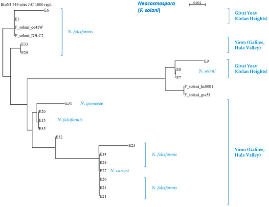 Such subspecies families can be easily noted in the Neocosmospora branch (Figure 7), where the subdivision is related to the collection site and/or the onion cultivar source. An agreement exists between the ISSR and the phylogenetic analysis regarding some of the sub-branches. For example, the E7, E8, and E9 isolates (N. falciformis) are differentiated as separate branches of Neocosmospora SC in the phylogenetic tree and share a unique DNA profiling in the ISSR results. This compatibility between the two methods also exists with respect to the E14, E21, E23, E24, E26, E27, and E28 isolate groups. Yet, some isolates are associated differently (i.e., belong to different subspecies families) by the two methods (for example, E21, E24, and E26).