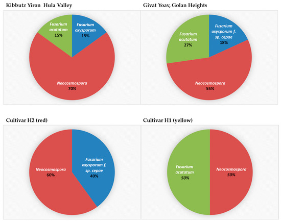 The segmentation of isolates according to their place of origin and the host species revealed an interesting pattern (Figure 8). In yellow onions of the Orlando cv. grown in Galilee (Hula Valley), Neocosmospora SC was found with the other two species, F. inflexum (F. oxysporum SC) and F. acutatum. In contrast, the Golan Heights bulb sample Fusarium spp.’s colonization was divided between species populating red or yellow onion cultivars. The Golan Heights results supported the findings of the work by Kalman et al. [21]. According to the former and current reports, F. oxysporum f. sp. cepae is abundant in red onions (Ha4/Ha2 cv.), while F. acutatum dominates yellow onions (Ha1 cv.). It was curious to discover that Neocosmospora SC inhabited both onion cultivars in the Golan Heights.
