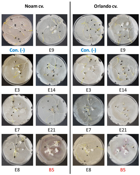 The onion germination pathogenicity assay. Onion seeds from the Orlando (Riverside) and Noam cultivars were used for the pathogenicity test of selected Neocosmospora (F. solani) isolates (see Table 3). Each group of 10 germinating sprouts was inoculated with a 6 mm diameter disc from a 5-day Fusarium sp. colony in the center of a Petri dish. The F. acutatum (isolate B5 [21], highlighted in red) was used as a positive control. The control group (Con. [-], highlighted in blue) was grown without inoculation. Photos of representative seeds’ plates, taken nine days post incubation at 28 ± 1 °C in the dark, show minor or massive Fusarium white mycelial growth on or near the onion seeds, attributed to their growth suppression.