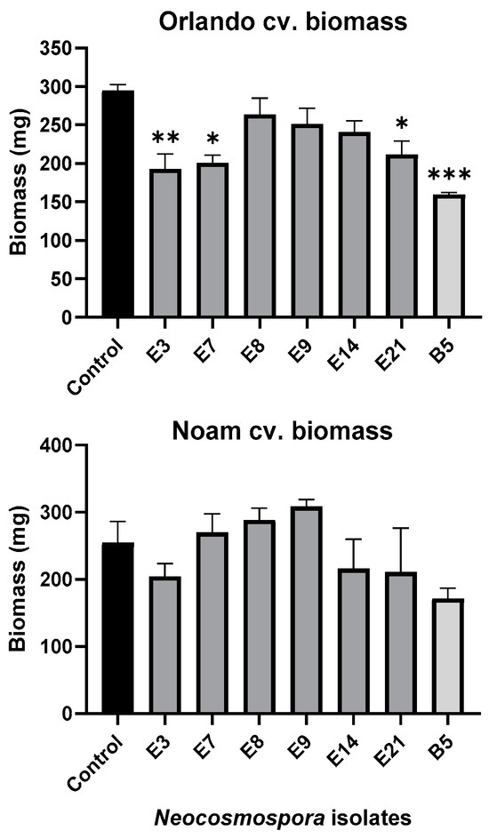 Seedlings’ fresh biomass in the pathogenicity experiment (presented in Figure 9). The wet biomass of the resulting seedlings was measured after a nine-day incubation period. The standard error of the mean of four replicates is shown by the vertical upper bars, with asterisks above the error bars indicating a significant difference (* p < 0.05, ** p < 0.005, *** p < 0.0005) between each group and the control in the one-way analysis of variance (ANOVA).