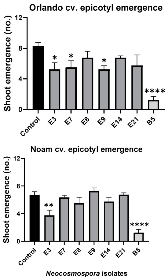 Seedlings’ epicotyl emergence number (out of ten per plate) in the pathogenicity experiment (presented in Figure 9). The standard error of the mean of four replicates is shown by the vertical upper bars, with asterisks above the error bars indicating a significant difference (* p < 0.05, ** p < 0.005, **** p < 0.00005) between each group and the control in ANOVA test.