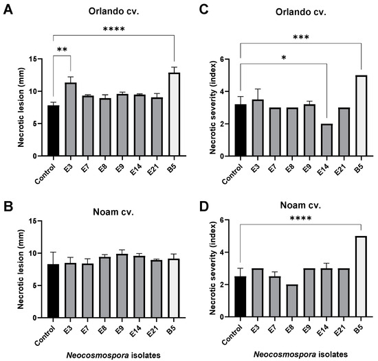 The bulb infection assay results (Figure 12 and Figure 13) were similar to the seedlings’ assay outcome. The intact onion bulb virulence assay rapidly assesses the Fusarium isolates’ ability to invade and thrive in host tissues [21]. In this assay, onion bulbs of the Orlando and Noam varieties were inoculated with six selected Neocosmospora isolates, resulting in the appearance of early symptoms two weeks post-infection. The bulbs’ basal plate exterior and interior tissue decay (up to 45% and 20% necrotic lesion dimensions and severity) and mycelial growth emergence on the bulb surface all indicated infection. The symptoms observed in this assay closely resembled those surveyed in onion fields naturally infected with the pathogen (Figure 2). Here, also (as in the seedling assay), the Neocosmospora isolates were less aggressive (41–45% less necrotic) than F. acutatum (B5 isolate). Also, the Orlando cv. was more susceptible to FBR than the Noam cv. Among the Neocosmospora SC isolates tested, E3 (N. falciformis isolate) was the most virulent strain in the bulbs’ pathogenicity assay, with a significantly larger necrotic lesion than the control in the Orlando cv. At the end of the experiment, Neocosmospora species were re-isolated from the infected bulbs and identified to satisfy Koch’s postulates.