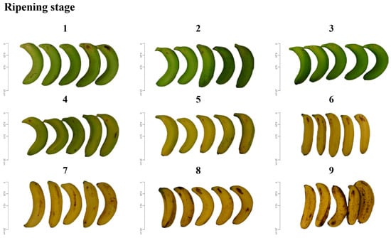 All bananas (AAA Cavendish Var. Pei Chiao, originating from Zhushan Township, Nantou, Taiwan) were purchased from Tai-Yi Agricultural and Livestock Products Co. (Taichung, Taiwan) between February and April 2023. The banana plants were grown in flood deposited sandy soil under 25–30 °C. Bananas harvested on the same day were delivered to Tai-Yi Co. (around 30 kg) within 2 h at room temperature, followed by pre-cooling (at 12–18 °C for 24 h), then ripening treatment with 1000 ppm ethylene at 15 °C. In this study, the bananas were divided into 9 stages of peel color according to the ripening schedule [31,32] (Figure 1), immediately placed in plastic bags (around 3 kg per stage), and returned to the laboratory for 15 min for analysis. Unless otherwise specified, all chemicals used in this study were purchased from Sigma-Aldrich (Merck KGaA, Darmstadt, Germany).
