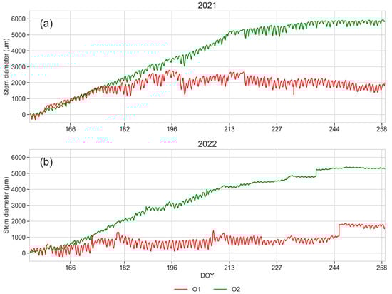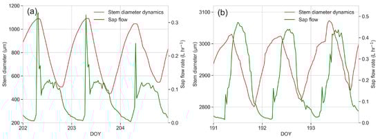 - Dietrich, L.; Zweifel, R.; Kahmen, A. Daily Stem Diameter Variations Can Predict the Canopy Water Status of Mature Temperate Trees. Tree Physiol. 2018, 38, 941–952. [Google Scholar] [CrossRef] [PubMed]