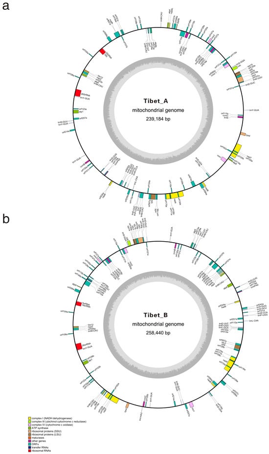 Both Tibet A and B mitochondrial genomes contain 33 protein-coding genes, 3 rRNA genes, and 16 types of tRNA genes (Figure 1, Table S1). Among the 33 conserved protein-coding genes, 18 are associated with the electron transport chain and ATP synthesis, comprising nine Complex I genes (nad1, nad2, nad3, nad4, nad4L, nad5, nad6, nad7, and nad9), one Complex III gene (cob), three Complex IV genes (cox1, cox2, and cox3), and five Complex V genes (atp1, atp4, atp6, atp8, and atp9). Additionally, five genes are related to the biogenesis of cytochrome C (ccmFC, ccmFN1, ccmFN2, ccmB, and ccmC), eight genes encode ribosomal protein (rpl2, rpl5, rpl16, rps3, rps4, rps7, rps12, and rps14), and the remaining two encode maturase (matR) and orfX (tatc). Both mitochondrial genomes of Tibet A and Tibet B have two copies of atp9, and compared to Tibet A, there is variation causing non-synonymous mutation (from valine to isoleucine) at the 22nd amino acid position between two atp9 genes, which is consistent with the difference within the DCGMS mitotype and NWB CMS YB-A mitotype [,], while the sequences of two atp9 genes in Tibet B mitotype are entirely identical.