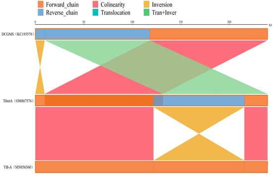 Analysis of syntenic sequences among the DCGMS (KC193578), NWB CMS YB-A (MN056360), and Tibet A lines. The three parallel bars represent the mitochondrial genomes. Dark-orange and blue regions in each bar represent the forward and reverse directions of the aligned genome, respectively. Lines between the two bars indicate the synteny types and locations as follows: deep-pink, dark-yellow, and light-green represent collinearity, inversion, and translocation + inversion, respectively.