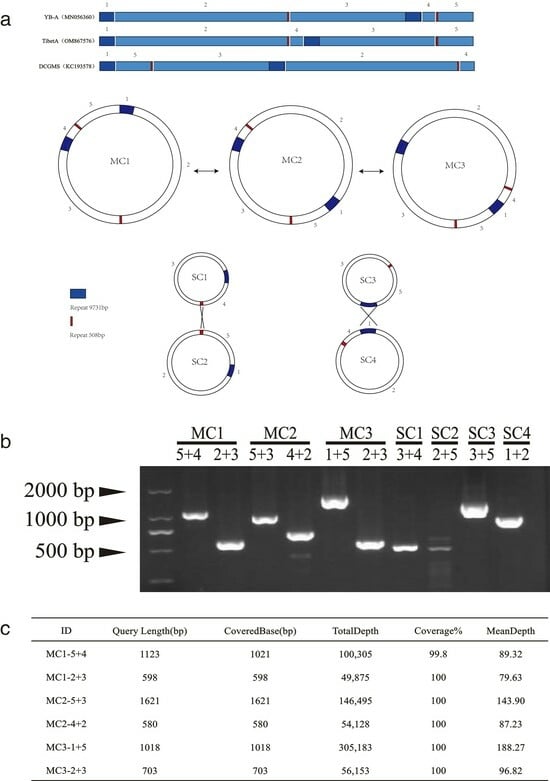 (a) Schematic diagram presenting the five syntenic blocks among the DCGMS, NWB CMS YB-A, and TibetA mitochondrial genomes, the three convertible master circles (MC), and the combinable subgenomic circles (SC). Cross lines between SC1 and SC2 and between SC3 and SC4 indicate the recombination locations. The filled boxes represent repeat sequences. (b) PCR-amplified products with primers annealing to sequence blocks around the junctions. (c) The PacBio sequencing data for the sequence of MC1(5 + 4)/MC1(2 + 3)/MC2(5 +3)/MC2(4 + 2)/MC3(1 + 5)/MC3(2 + 3) amplification.
