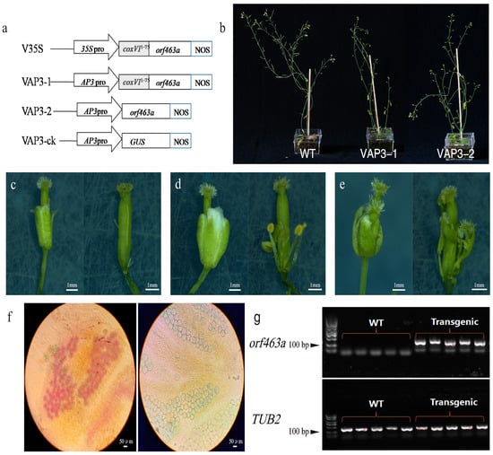 (a) Vectors for genetic transformation of Arabidopsis. (b–e) Sterile phenotypic characteristics resulting from the genetic transformation of Arabidopsis via vectors VAP3-1 or VAP3-2. (f) Alexander staining of wild-type Arabidopsis anthers (left) and petal-deficient abortion anthers (right). (g) Expression analysis of orf463a in transgenic Arabidopsis plants.