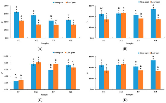 The colour of the stem and leaf parts of fermented Chinese mustard greens. (A) L*, (B) C*, (C) a*, (D) b*. ST is Shantou, MZ is Meizhou, YF is Yunfu, and GZ is Guangzhou. Means designated by the same letters (uppercase, among different samples; lowercase, among stem parts and leaf parts) are significantly different according to Duncan’s test. Bars represent the means ± SD (n = 3, p < 0.05).