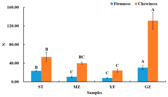 The firmness and chewiness of fermented Chinese mustard greens. ST is Shantou, MZ is Meizhou, YF is Yunfu, and GZ is Guangzhou. Means designated by the same letters (uppercase, among different samples) are significantly different according to Duncan’s test. Bars represent means ± SDs (n = 3, p < 0.05).