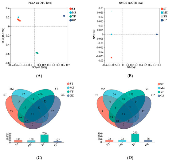 Beta diversity and Venn diagrams of the bacterial community of fermented Chinese mustard greens. (A) Principal coordinate analysis (PCoA). (B) Nonmetric multidimensional scaling (NMDS). Venn diagrams at the OTU (C) and genus (D) levels according to bacterial biodiversity. ST is Shantou, MZ is Meizhou, YF is Yunfu, and GZ is Guangzhou.