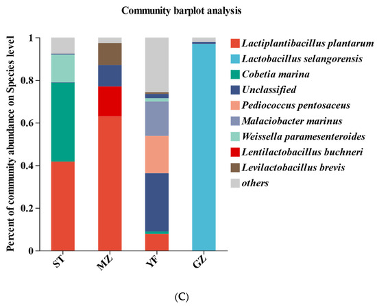 Lactiplantibacillus plantarum, Lactobacillus selangorensis, Cobetia marina, Pediococcus pentosaceus, Malaciobacter marinus, Weissella paramesenteroides, Lentilactobacillus buchneri, and Levilactobacillus brevis were the most representative species in all the samples at the species level (Figure 5C). Lactobacillus plantarum (41.75%), Cobetia marina (37%), and Weissella paramesenteroides (13.08%) were abundant in the ST samples. Lactobacillus plantarum (62.98%) was most abundant in the MZ samples, followed by Lactobacillus buchneri (14.03%) and Lactobacillus brevis (10.31%). Notably, Lactobacillus selangorensis (96.97%) was dominant in the GZ samples. However, Lactiplantibacillus plantarum accounted for only 7.79% of the YF samples, while Pediococcus pentosaceus (17.5%), Malaciobacter marinus (16.14%), Weissella paramesenteroides (1.55%), and Cobetia marina (1.13%) were abundant in the YF samples.