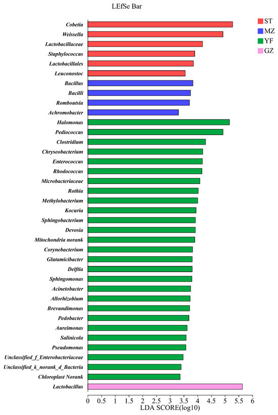 The microbial communities in different groups were analysed according to the relative abundance of the microbial composition via linear discriminant analysis effect size (LEfSe) (Figure 6). Cobetia, Weissella, Lactobacillaceae, Staphylococcus, Lactobacillales, and Leuconostoc were enriched in the ST samples. Bacillus, Bacilli, Romboutsia, and Achromobacter were enriched in the MZ samples. Twenty-seven genera were enriched in the YF samples. Only Lactobacillus was enriched in the GZ samples.