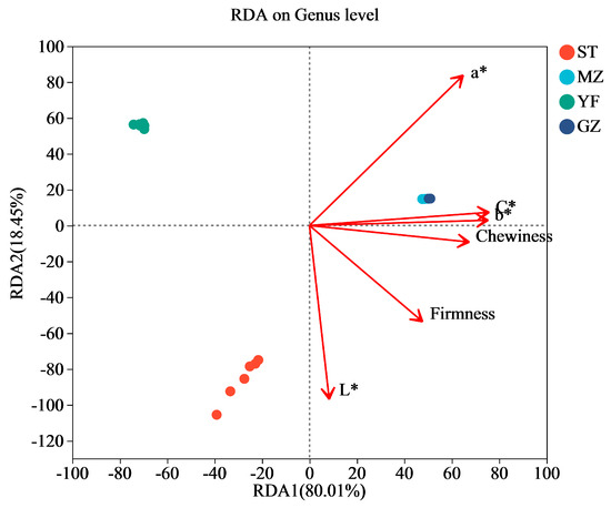 The results of the redundancy analysis (RDA) suggested that there was a strong correlation between quality (colour and texture) and the microbial communities (Figure 7). The horizontal axis was positively related to the contents of chewiness, rirmness, L*, a*, b*, and C*. The a* values of the colour of the Chinese mustard greens had the greatest impact on the bacterial communities, followed by the L*, C*, b* values, firmness, and chewiness. According to the Mantel test analysis, a* (r = 0.9291, p = 0.001) had the strongest correlation with microbial abundance, followed by L* (r = 0.7725, p = 0.001), C* (r = 0.4813, p = 0.001), b* (r = 0.4719, p = 0.001), firmness (r = 0.4199, p = 0.006), and chewiness (r = 0.382, p = 0.008). The colour indices (C* and b*) and texture (chewiness) were more strongly correlated with the MZ and GZ samples. L* values are more strongly correlated with the ST samples. For the YF samples, the correlation between the quality indices (colour and texture) and YF samples was not greater than that for the other samples. Furthermore, both RDA1 and RDA2 had an explanatory power of 98.46%, but further research is needed to investigate the relationships between species and quality indicators.