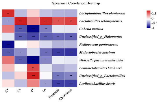 As shown in Figure 8, the colour quality indices (L*, C*, a*, and b*) and texture quality indices (firmness and chewiness) were correlated with the main bacterial community of the traditional Chinese mustard greens. L. plantarum was significantly positively correlated with L*. L. selangorensis was positively correlated with C*, b*, firmness, and chewiness. Lactobacillus buchneri was significantly positively correlated with a*. Cobetia marina was negatively significantly correlated with C*, a*, and b*, and Pediococcus pentosaceus was negatively significantly correlated with L*. Malacibacter marinus was significantly correlated with L*, C*, b*, firmness, and chewiness. Weissella paramesenteroides was significantly negatively correlated with C*, a*, and b*. Lactobacillus brecis was significantly negatively correlated with b*, firmness, and chewiness.