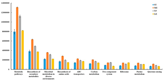 A PICRUSt model was applied to four regions of fermented Chinese mustard greens to predict their microbial community functions (Figure 9). Bacterial-related genes involved in metabolism, genetic information processing, environmental information processing, human diseases, cellular processes, and organism systems were detected in all the groups. Microbial communities are characterized by metabolism-related genes, which suggests that metabolism plays a major role. In all groups, the metabolic pathway with the greatest enrichment was at level 3, followed by biosynthesis of secondary metabolites, microbial metabolism in diverse environments, biosynthesis of amino acids, ABC transporters, carbon metabolism, two-component system, ribosome, purine metabolism, and quorum sensing, which showed significant differences among all groups. The ability of the MZ samples to predict metabolic pathways was the highest among all the samples.