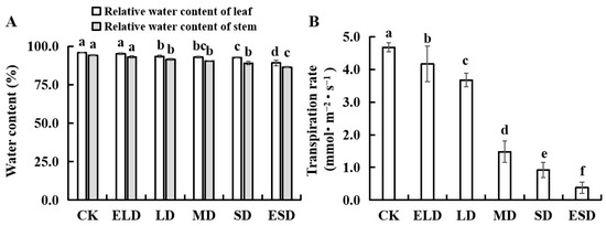 3.2. Effect of Gradient Drought Stress on the Water Content and Transpiration Rates in the Leaves and Stems of B. semperflorens