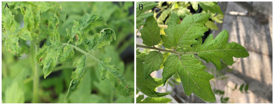 Phenotypes of tomato plants of the “Moneymaker” variety in a bioassay to evaluate ToBRFV infectivity four weeks post mechanical inoculation using runoff water samples collected from commercial greenhouses. (A) Typical mottling, mosaic, and chlorosis symptoms on tomato plants inoculated with water sample V22-43, which tested positive for ToBRFV during qRT-PCR. (B) A typical asymptomatic tomato leaf on a tomato plant inoculated with the other water samples that did not cause virus infection and tested negative for ToBRFV.