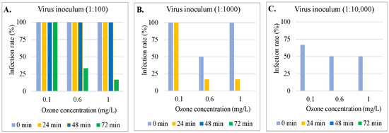 Assessing the effectiveness of a treatment against ToBRFV infectivity in bioassays using three concentrations of cold plasma ozone on three dilutions of ToBRFV-infected plant tissue extracted in experimental water reservoirs. Panel (A): Percentage of the test tomato plants (6) infected in the bioassays in a virus inoculum at a 1:100 dilution upon exposure for 0 min, 24 min, 48 min, and 72 min using three concentrations of cold plasma ozone (0.1, 0.6, and 1 mg/L). Panel (B): Percentage of the test tomato plants (6) infected in the bioassays in a virus inoculum at a 1:1000 dilution upon exposure for 0 min, 24 min, 48 min, and 72 min using three concentrations of cold plasma ozone (0.1, 0.6, and 1 mg/L). Panel (C): Percentage of the test tomato plants (6) infected in the bioassays in a virus inoculum at a 1:10,000 dilution upon exposure for 0 min, 24 min, 48 min, and 72 min using three concentrations of cold plasma ozone (0.1, 0.6, and 1 mg/L).
