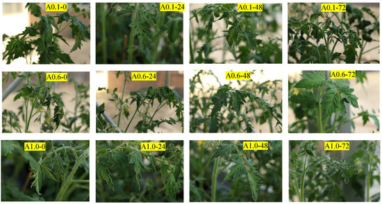 The phenotypes of the tomato plants in the bioassays to assess the efficacy of a cold plasma ozone treatment using a virus inoculum at a 1:100 dilution upon exposure for 0 min, 24 min, 48 min, and 72 min using three concentrations of cold plasma ozone (0.1, 0.6, and 1 mg/L). The label in each panel represented by A is the virus inoculum in a 1:100 dilution of ToBRFV-infected tomato tissue sap, followed by the ozone concentration (0.1, 0.6, or 1.0 mg/L), and, finally, the exposure time (0, 24, 48, or 72 min).