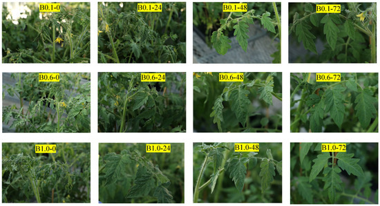 The phenotypes of the tomato plants in the bioassays to assess the efficacy of a cold plasma ozone treatment using a virus inoculum at a 1:1000 dilution (B) upon exposure for 0 min, 24 min, 48 min, and 72 min using three concentrations of cold plasma ozone (0.1, 0.6, and 1 mg/L). The label in each panel represented by B is the virus inoculum in a 1:1000 dilution of ToBRFV-infected tomato tissue sap, followed by the ozone concentration (0.1, 0.6, or 1.0 mg/L), and, finally, the exposure time (0, 24, 48, or 72 min).