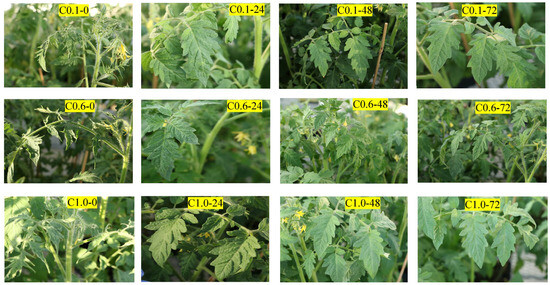 The phenotypes of the tomato plants in the bioassays to assess the efficacy of a cold plasma ozone treatment using a virus inoculum at a 1:10,000 dilution (C) upon exposure for 0 min, 24 min, 48 min, and 72 min using three concentrations of cold plasma ozone (0.1, 0.6, and 1 mg/L). The label in each panel represented by C is the virus inoculum in a 1:10,000 dilution of ToBRFV-infected tomato tissue sap, followed by the ozone concentration (0.1, 0.6, or 1.0 mg/L), and, finally, the exposure time (0, 24, 48, or 72 min).
