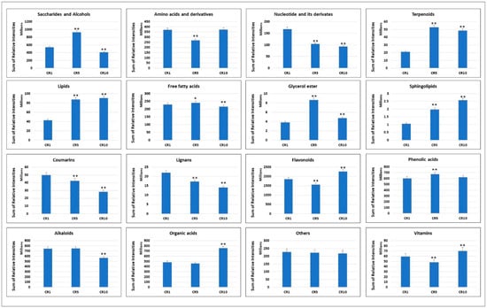 3.3. Differential Metabolic Profiles of Chuan Chenpi Dried Peels Subjected to 1, 5 and 10 Years of Storage