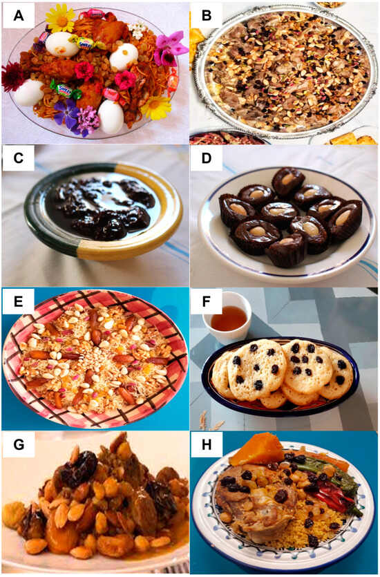 Traditional Tunisian dishes prepared with raisin: (A) Douida; (B) Borzgane; (C) Charmoula; (D) Laklouka; (E) Rechta Njara Hloua; (F) Ftayer be Zbib; (G) Marka Hlouwa; (H) Couscous with lamb.