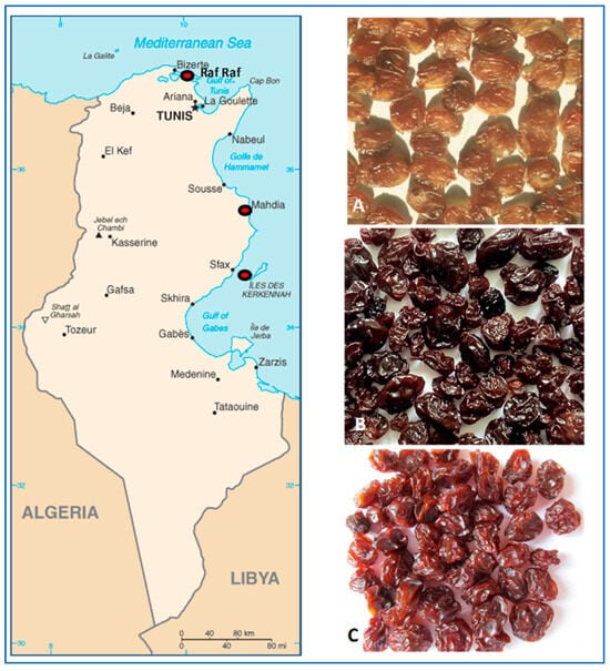 Map of Tunisia with areas preserving local grapevine varieties used as dried raisins in traditional foods: (A) “Meski” variety native from Raf Raf; (B) Razzegui variety native from Mahdia. (C) Asli variety native from Kerkennah.