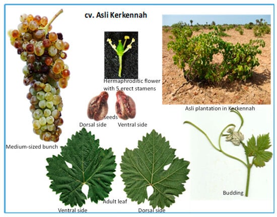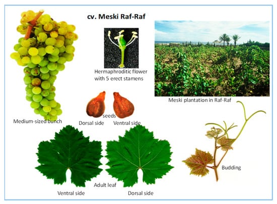 Among others, significant are the grapevine varieties Meski from Raf Raf, Asli from Kerkennah and Razzegui from Mahdia [] (Figure 2).