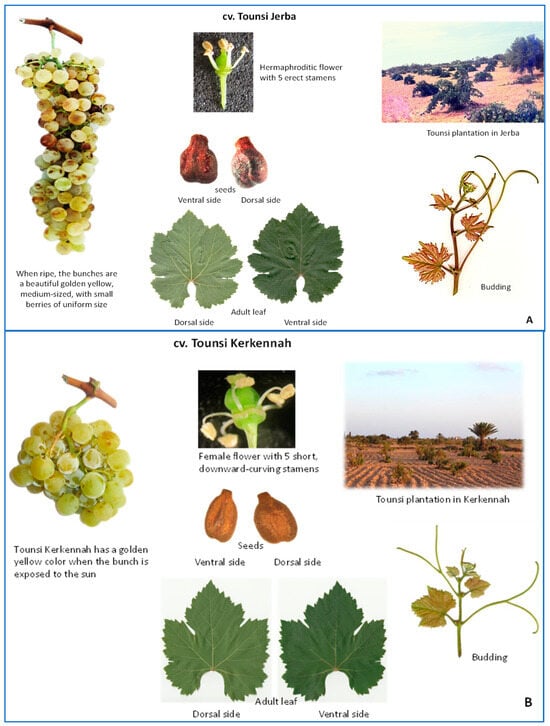 In south-eastern Tunisia, the island of Djerba is a center for the preservation of indigenous grape varieties. In particular, the autochthonous variety “Tounsi Djerba” (Figure 6A) has been preserved on the island. The variety differs from the homonymous “Tounsi” typical of the Kerkennan Islands (Figure 6B) [], both phenotypically, at leaf, flower, and bunch level [], and genetically. According to Zoghlami et al. [], the variety “Tounsi Djerba” is genetically more related to the variety Asli and the red, highly aromatic variety “Khamri”, which is typical of northern Tunisia, where it is used for the production of a high-quality traditional wine and for table grapes. On the island, the variety is traditionally used by the local Jewish community of El Hara to produce a typical wine according to specific and ancient techniques that are still practiced today [,]. The variety is also used for the preparation of “maâkoud”, a type of sweetened/savory sauce made from beef cooked in grapevine juice and thickened with starch, prepared for the Anchoura festival, which celebrates the liberation of Moseh from the Faraoh (Table 2).