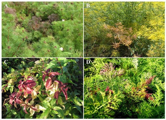 Symptoms caused by ‘Ca. Phytoplasma solani’ on (A) peony—P. tenuifolia, (B) dill—A. graveolens, (C) mint—Mentha × piperita, and (D) carrot—D. carota.