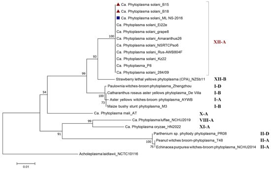 The NJ phylogenetic tree based on the 16S rRNA sequences of three tested Serbian ‘Ca. Phytoplasma solani’ strains from P. tenuifolia (B15 and B18) and D. carota (ML_NS-2016) and the comparative Phytoplasma spp. strains from different hosts/countries is presented in Figure 3. Based on the constructed tree, all tested/comparative ‘Ca. Phytoplasma solani’ strains were placed in the same tree cluster (the XII-A 16Sr Group) showing genetic homogeneity among themselves regardless of the host/country of origin. The remaining Phytoplasma spp. strains belonging to 16Sr Groups I (A, B, and D), II (A and D), VIII-A, X-A, XI-A, and XII-B were clearly separated in other tree branches/clusters, each corresponding to a specific 16Sr Group. Acholeplasma laidlawii strain NCTC10116 was placed on a monophyletic tree branch, as an outgroup (Figure 3).