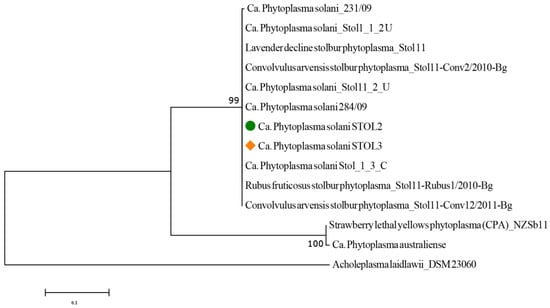 The second NJ phylogenetic tree was constructed based on the plsC gene (1-acyl-sn-glycerol-3-phosphate acyltransferase) sequences with the remaining two Serbian ‘Ca. Phytoplasma solani’ strains of interest, originating from A. graveolens (STOL2) [] and Mentha × piperita (STOL3) [], and 13 comparative Phytoplasma spp. strains from different hosts and countries (Table 2), which were also from GenBank. This tree was rooted with Acholeplasma laidlawii strain DSM 23060 (Table 2).