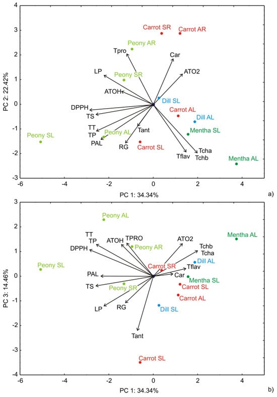 According to the PCA, the carrot SR and carrot AR samples were characterized by the highest Car content, while peony SL and peony AL were noted to obtain the most prominent value of DPPH, TS, TT TP, PAL, and RG content. The sample mint AL was characterized by augmented Tflav, Tcha, and Tchb contents.