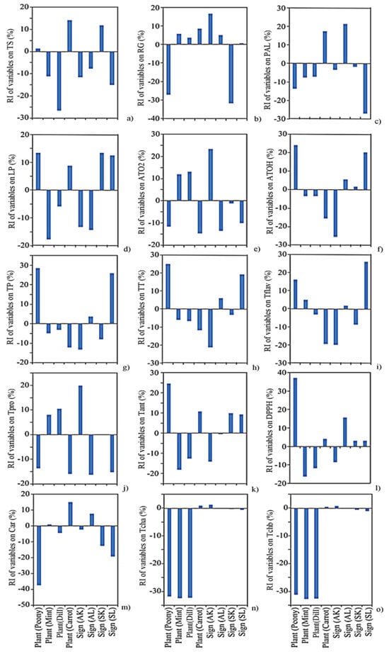 A sensitivity analysis was conducted to determine the relative influence (RI) of inputs (such as plant type and treatment) on TS, RG, PAL, LP, NBT, •OH, TP, TT, Tflav, Tpro, Tant, DPPH, Tcha, Tchb, and Car, The results, shown in Figure 6, indicate how outputs change with respect to infinitesimal changes in inputs, reflecting both experimental errors and the inputs’ influence on the outputs.