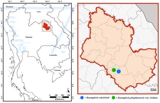 Between 2020 and 2023, plant specimens of the two taxa were obtained from their natural habitat in Sakon Nakhon Province, northeastern Thailand (Figure 1). Both living specimens and specimens preserved in 70% ethyl alcohol were meticulously examined and measured using stereo microscopy. Photographic documentation was carried out for the living specimens in their natural habitat and under cultivation. Holotype specimens were deposited at Khon Kaen University Herbarium (KKU) and isotypes were deposited at Bangkok Herbarium (BK) and The Herbarium of Faculty of Forestry (FOF), while living specimens were housed at the Diversity of Family Zingiberaceae and Vascular Plant for Its Applications Research Unit’s Garden in Maha Sarakham Province, Thailand. Detailed descriptions and relevant data for all taxa within the Kaempferia genus were systematically compared. Data on their utilization were acquired by local inhabitants near each type’s locality. A preliminary conservation assessment was conducted following the IUCN Red List Categories [38]. Elevation data were gathered using the View Ranger application, and line drawings were produced using digital tools on an iPad Air 5 (version 17.2, 2022, Apple Inc., Cupertino, CA, USA) with the Pixelmator Pro Program (version 3.5.6 (Flare), 2023, Pixelmator Team, Vilnius, Lithuania).