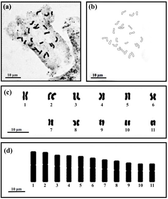 Kaempferia sakolchaii has 2n = 22 somatic chromosomes and the Fundamental Number (NF) = 44 (Figure 4a, Table 1). The karyotype has six pairs of metacentric chromosomes and five pairs of submetacentric chromosomes. The karyotype formula of 12m + 10sm chromosomes places it in the symmetrical karyotype group (Figure 4b). The short arm length is from 0.88 ± 0.06 to 1.78 ± 0.09 µm, the long arm length is from 1.43 ± 0.09 to 2.77 ± 0.64 µm, and the total chromosomal length is from 2.44 ± 0.15 to 4.46 ± 0.73 µm. The relative length (RL) ranges from 6.53 to 11.96%, while the centromeric index (CI) ranges from 0.51 to 0.64, as shown in Table 1. Figure 4d shows the idiogram created.
