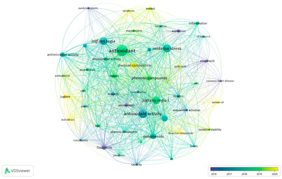 A diverse array of the scientific literature is within the domain of science and is archived in numerous databases, including Google Scholar, PubMed, Scopus, and Web of Science (WoS). The authors of this review opted to utilize Web of Science due to its status as an ancient, authoritative, and extensively utilized database that encompasses citations and research publications from around the globe, including information from thousands of journals [22]. Indeed, as a prominent literature archive and data source, WoS comprises peer-reviewed articles. Its interface is straightforward and intuitive, facilitating the process of conducting bibliographic reviews of the literature and visualizing data through applications such as VOS viewer. The authors used the following search words in WoS: (“green walnut” OR “unripe walnut” OR “Juglans regia” OR “walnut extract” OR “walnut oil”) AND (medicinal OR pharmaceutical OR therapeutic OR “health benefits”) AND (antioxidant* OR anti-inflammatory OR nutraceutical* OR “natural products”). Then, after obtaining the search results, they were analysed using VOS Viewer software (Version 1.5.5), developed by Liden University, Netherlands [23]. The results, as shown in Figure 1, were obtained from the top keywords used, i.e., green walnut, walnut, its applications, bioactive compounds, its properties and characterization, walnut husk, etc., using Vos viewer software (Version-1.6.20 for iOS).