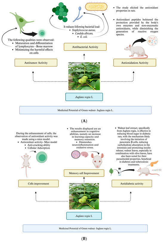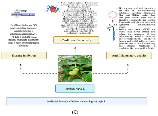 (A–C) Medicinal potentials of J. regia L.
