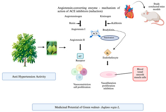 Multiple investigations have revealed that the by-products of walnuts possess powerful enzyme inhibitory properties. One study examined the impact of walnut seed extract, both with and without the shell, on rats. Researchers found that extracts from roasted walnuts in their shells were more effective in inhibiting the formation of ACE, phosphodiesterase-5, arginase, and acetylcholinesterase [121]. A small group of researchers noted that the inclusion of WS extract in LPS-stimulated macrophages resulted in a decrease in the production of AP-1, TNF-α, IL-8, iNOS, and COX-2 genes [122]. ACE, which stands for angiotensin-converting enzyme, is a key enzyme involved in regulating blood pressure. ACE inhibitory peptides could regulate the activity of ACE. All ACE inhibitors effectively prevent the conversion of angiotensin I to angiotensin II, and their physiological and therapeutic effects are similar. Walnut extract is a commonly used source of ACE inhibitory peptides. Research is currently underway to discover further benefits of green walnut extract as enzymatic inhibitors (Figure 3C).