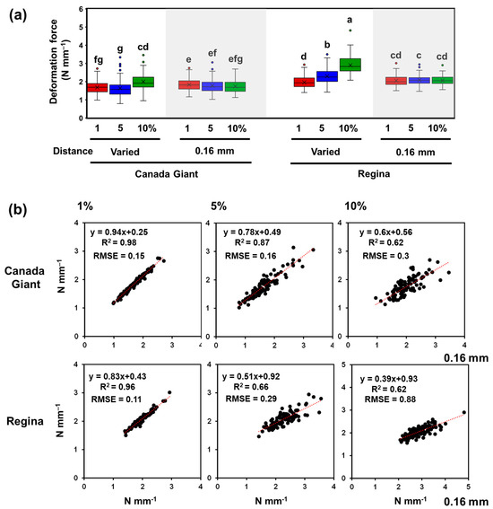 (a) Normalized deformation force (N mm−1) of three different compression conditions (1, 5, 10%) and a fixed compression distance (0.16 mm) on the small thickness dimension of the fruit. (b) Scatter plot between the fixed (x axis) distance and the corresponding varied (y axis) distance. One hundred fruit for each condition and cultivar were used to create the box plot. Different letters indicate significant differences among treatments based on Duncan’s multiple range test (p ≤ 0.05). Best-fit linear regression, R squared, and the root-mean-square error (RMSE) were defined in each cultivar and in the pair of varied and fixed distance treatments. Data are provided in Table S1.