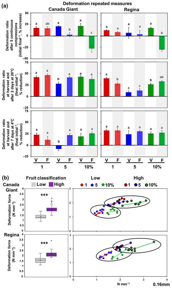 The purpose of these tests was to assess the effectiveness of monitoring the firmness of cherries’ flesh, as depicted in Figure 2a. Both cultivars exhibited a negative percentage increase in a fixed distance after undergoing five continuous compressions in 10% (Figure 2a). Moreover, in Canada Giant, the fixed distance after five continuous compressions in a 5% deformation force had the lowest increase of 2.7% compared to the others (various and fixed distance), and the elevation in firmness ranged from 16.5% to 21.6% after five continuous compressions (Table S1 and Figure 2a). In addition, Regina firmness increase ranged from 3.8% (fixed distance after five continuous compressions in 5%) to 17.4% (10% deformation force) following five continuous compressions (Table S1 and Figure 2a). After 2 days of shelf life at 20 °C, Canada Giant cherries exhibited a reduction in firmness, ranging from 24.1% (5% deformation force) to 32.5% (fixed distance after 5% deformation force and 2 days at 20 °C). In parallel, Regina cherries showed a lower reduction in the 5% deformation at a varied distance of 9% and a fixed distance of 12.9% than 1% and 10% deformation forces after 2 days at 20 °C, ranging from 26.4 to 39.5% (Table S1 and Figure 2a). An increase in firmness was recorded for a 5% deformation force in sweet cherries of Canada Giant after 7 days of cold storage (4 °C), while for the rest of the deformation conditions, the reduction ranged from 12% (fixed distance after 1% deformation force and 7 days at 4 °C) to 25.9% (fixed distance after 10% deformation force and 7 days at 4 °C). After 7 days at 4 °C, a decrease in firmness was observed in Regina fruit ranging from 27.9% (5% deformation force) to 46.7% in the fixed distance after 1% deformation force and 7 days at 4 °C (Table S1 and Figure 2a).