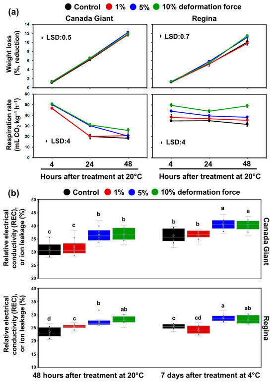 In addition, the respiratory activity of the fruit was often enhanced when subjected to deformation forces of 5% and 10%, regardless of the time point and cultivar. The only exception was seen after 48 h at 20 °C in the 5% deformation treatment of the Canada Giant cultivar. In contrast, the respiration rate of fruit subjected to a 1% deformation force did not show a significant impact (Table S2 and Figure 3a).