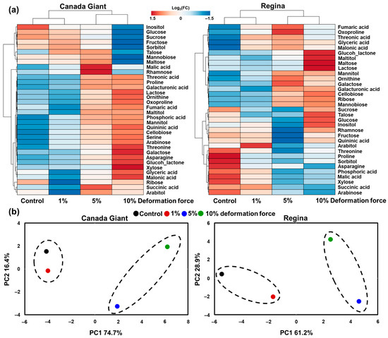 In response to treatments, 9 and 15 primary metabolites remained unaffected in Canada Giant and Regina, respectively, based on MANOVA. For instance, phosphoric acid, inositol, talose, and glucoheptonolactone showed no differences following treatments in both cultivars (Table S3). Generally, there was a clear separation in both cultivars due to hierarchical clustering analysis, leading to the first group where control and 1% deformation treatment grouped together and to the second group where 5% and 10% deformation treatments grouped together (Figure 4a). Furthermore, based on principal component analysis (PCA) for each cultivar, an obvious separation of the same groups (control and 1% deformation treatment compared to 5% and 10% deformation treatments) was detected, indicating that they are strongly related to PC1—principal component 1 (Figure 4b). In more detail, the variance of the metabolic data explained by the PCA model in Canada Giant was 91.1%, with 74.7% explained by PC1 and 16.4% by PC2, similarly in Regina, it was 90.1%, with 61.2% explained by PC1 and 28.9% by PC2 (Figure 4b).
