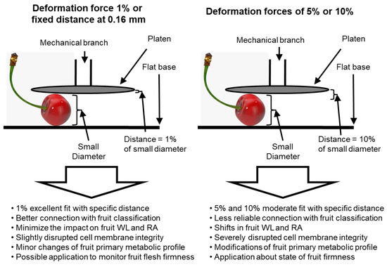 Schematic presentation of sweet cherry firmness measurements. Pros and cons during firmness determination when using a deformation force of 1% or a fixed distance of 0.16 mm on the left side and deformation forces of 5% or 10% on the right side. Abbreviations: WL, weight loss; RA, respiration activity.