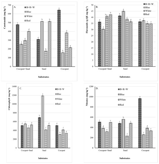 Effect of LED light on phytochemicals ((A) carotenoids, (B) flavonoids, (C) chlorophyll and (D) nitrates) under different substrates (cocopeat + sand, sand and cocopeat). Bars represent standard errors of means. Different letters indicate significant differences at p < 0.05.
