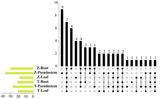UpSet plot of ‘Zhangqiu’ and ‘Tenko’ organs. The vertical bars’ height indicates the number of volatile compounds in this set overlap, as indicated by the dots and connecting lines in the plot’s bottom part. The height of the horizontal bars indicates the total number of volatile compounds per set. The letter ‘Z’ represents ‘Zhangqiu’, and ‘T’ represents ‘Tenko’.
