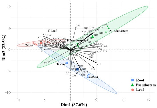 Principal component analysis (PCA) graphs of volatiles extracted from Welsh onions. Numbers on the loading plot represent compounds characteristic of the analyzed Welsh onions. Points of different types represent the three organs of ‘Zhangqiu’ and ‘Tenko’. The letter ‘Z’ means ‘Zhangqiu’, and ‘T’ represents ‘Tenko’. The percentage indicates the proportion of variance explained by each axis. Compound numbering is the same as the data provided in Table S1.
